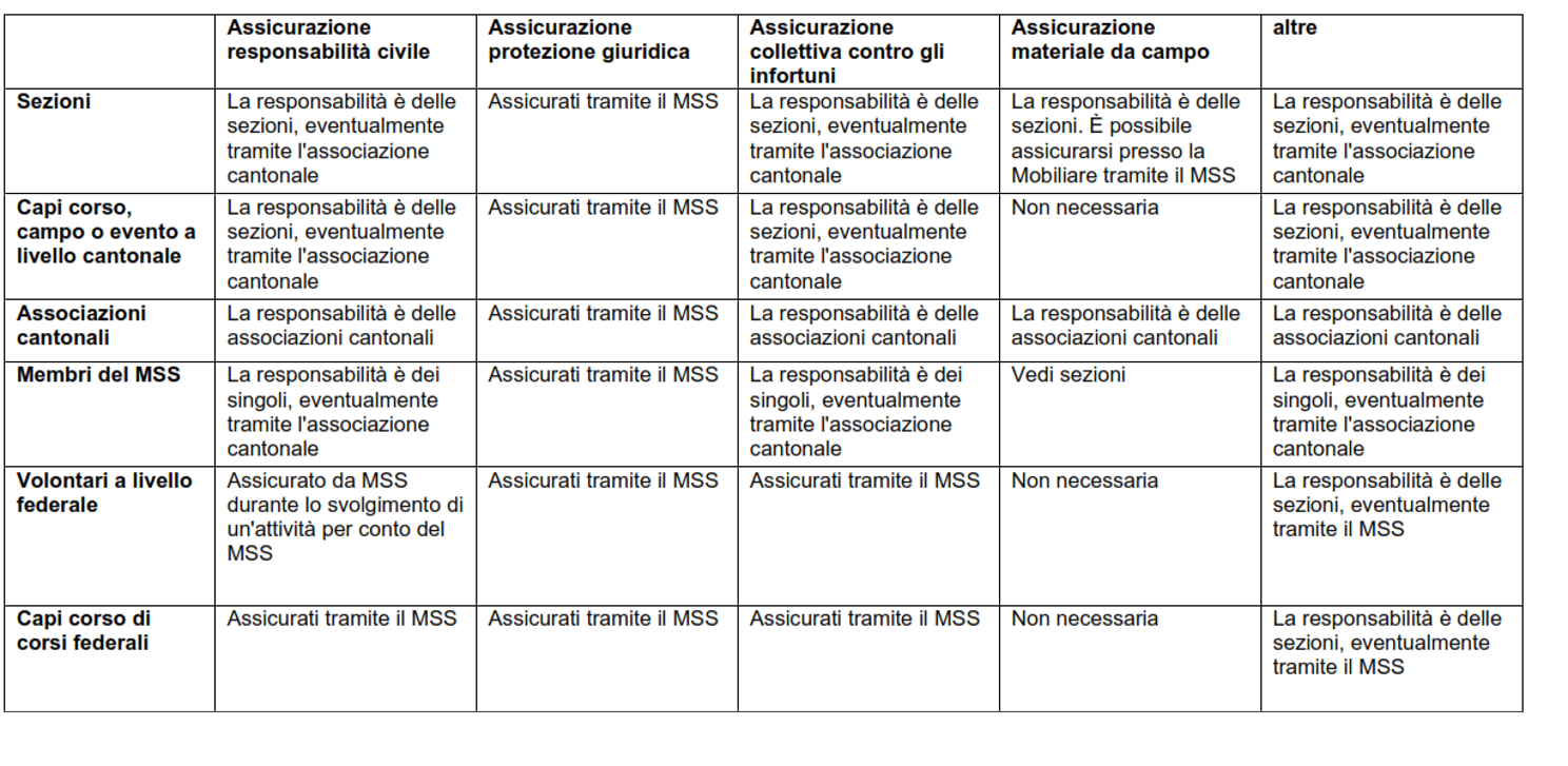 In caso di danni materiali copre le pretese finanziarie di altre persone contro di te. La responsabilità per l’assicurazione di responsabilità civile è di ogni singola persona. Il MSS non ha nessuna assicurazione di responsabilità civile per tutti i membri dell'associazione. Se su mandato del MSS vengono organizzati corsi federali, riunioni oppure viaggi gli organizzatori di queste attività sono per questo periodo coperti dall’assicurazione di responsabilità civile del MSS.